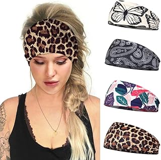 Sethexy Large Bandeau Imprimé léopard Bandeau Élastique Bande de cheveux Yoga Enveloppe de tête 4 pièces Fonctionnement Foulard Des sports Bandeau pour femmes et filles