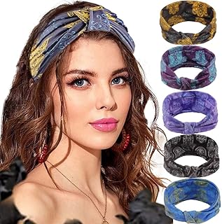 Sethexy Large Boho Yoga Bandeau Élastique Noué Bandeau Enveloppement de la tête 5 pièces Bande de cheveux Foulard Des sports Fonctionnement Bandeau pour les femmes et les filles